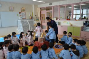 始園式 2022/01/20 園の様子行事 今日から3学期が始まりました。園庭に出来た大きな雪山に大喜びの子ども達!先生から「お外遊びのお約束」を聞いてから、元気一杯にソリ滑りを楽しんでいました。小ホールでは、お餅つきごっこを行いました。「ぺったんこ!ぺったんこ!」と順番に行いました。