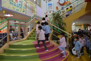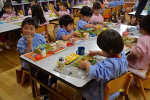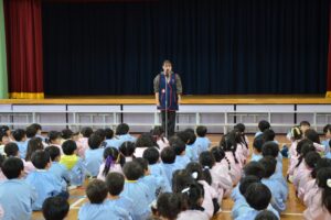 秋の避難訓練 2025/10/28 給食行事 秋の避難訓練を「地震が発生した後に火災が発生する」という想定で行いました。今回は雨天のためホールへ避難し、子ども達は落ち着いた様子で、「おさない・はしらない・しゃべらない・もどらない」のお約束を守り、迅速に避難することができました。 今日の給食は「わかめおにぎり、ソース焼きそば、たこ焼き、おでん、かぼちゃ煮、塩ゆで枝豆、ミニゼリー、お茶」でした。