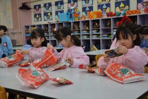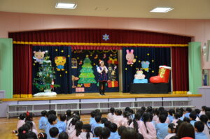 子ども達が楽しみにしていたクリスマス会の日!先生達による器楽演奏と共に「あわてんぼうのサンタクロース」を歌い、歌が終わると・・・サンタさんがあかしや幼稚園に来てくれました!!サンタさんと「クリスマスについての〇✕クイズ」を行い、教室に戻るとプレゼントが入った袋を見つけて、大喜びの子ども達!ご家庭でも良いクリスマスをお過ごしください!
