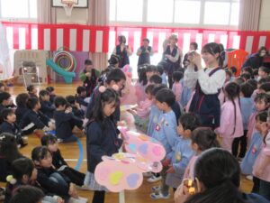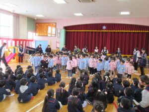 握手会(お別れ会) 2026/03/09 行事 ホールに園児が集まって、もうすぐ卒園を迎えるひまわり組の子ども達と、在園児・お世話になった先生達で握手会を行いました。在園児から卒園児に歌やお手紙のプレゼントをし、一人一人と握手をし、笑顔あり別れの涙ありの心温まる会となりました。